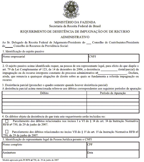 § 1º A desistência de impugnação ou recurso referida no caput deverá ser efetuada mediante petição dirigida ao Delegado da Receita Federal de Julgamento, ao Presidente do Conselho de Contribuintes ou ao Presidente do Conselho de Recursos da Previdência Social, conforme o caso, devidamente protocolada na unidade da RFB com jurisdição sobre o domicílio tributário do sujeito passivo, mediante apresentação do Termo de Desistência de Impugnação ou Recurso Administrativo, na forma do Anexo Único.