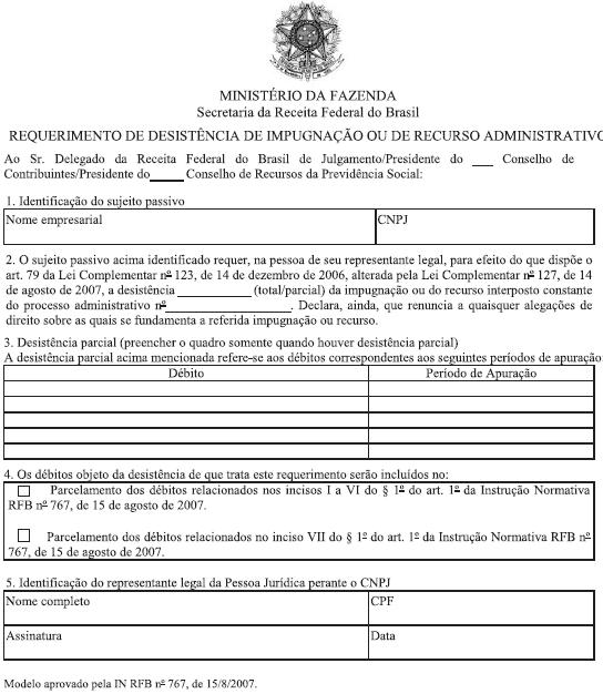§ 1º A desistência de impugnação ou recurso referida no caput deverá ser efetuada mediante petição dirigida ao Delegado da Receita Federal do Brasil de Julgamento, ao Presidente do Conselho de Contribuintes ou ao Presidente do Conselho de Recursos da Previdência Social, conforme o caso, devidamente protocolada na unidade da RFB com jurisdição sobre o domicílio tributário do sujeito passivo, mediante apresentação do Termo de Desistência de Impugnação ou Recurso Administrativo, na forma do Anexo Único.